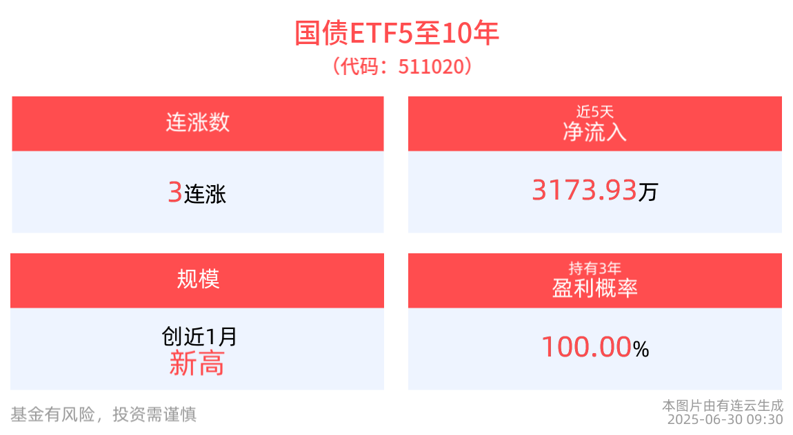 截至2025年6月30日 09:30,国债ETF5至10年(511020)上涨0.01%, 冲击3连涨。最新价报117.58元。截至6月27日,国债ETF5至10年近5年净值上涨20.50%。