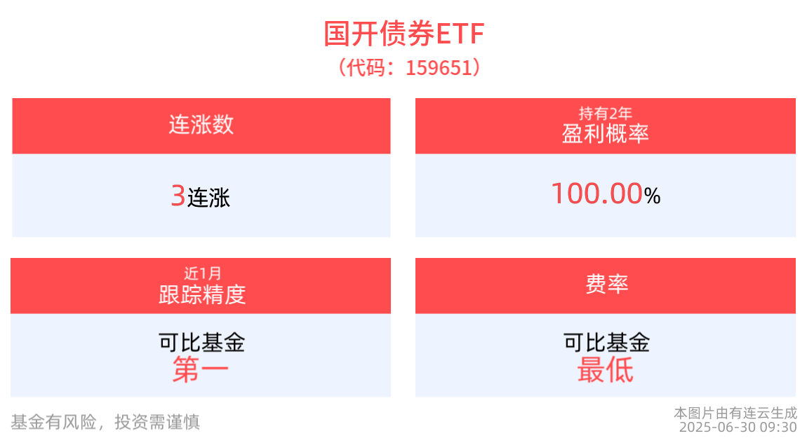 截至2025年6月30日 09:30,国开债券ETF(159651)上涨0.01%, 冲击3连涨。最新价报106.23元。