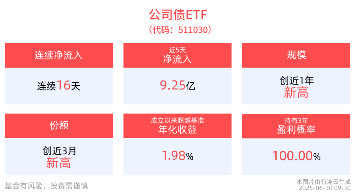 截至2025年6月30日 09:30,公司债ETF(511030)上涨0.04%,最新价报106.15元。